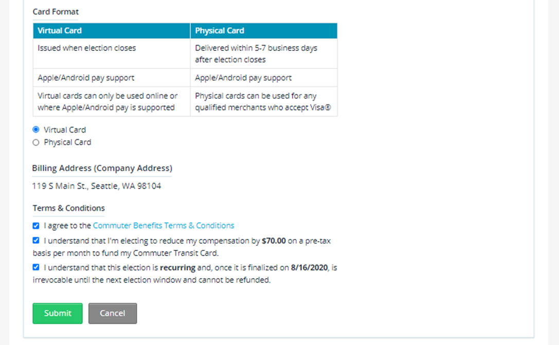 6. Scroll down and select your preferred card option. Most transit products may be purchased using a virtual card, which is the most flexible, easy to use option. To determine whether to elect a virtual card or physical card, Find Your Transit Agency and read the recommended instructions for purchasing your transit passes.
