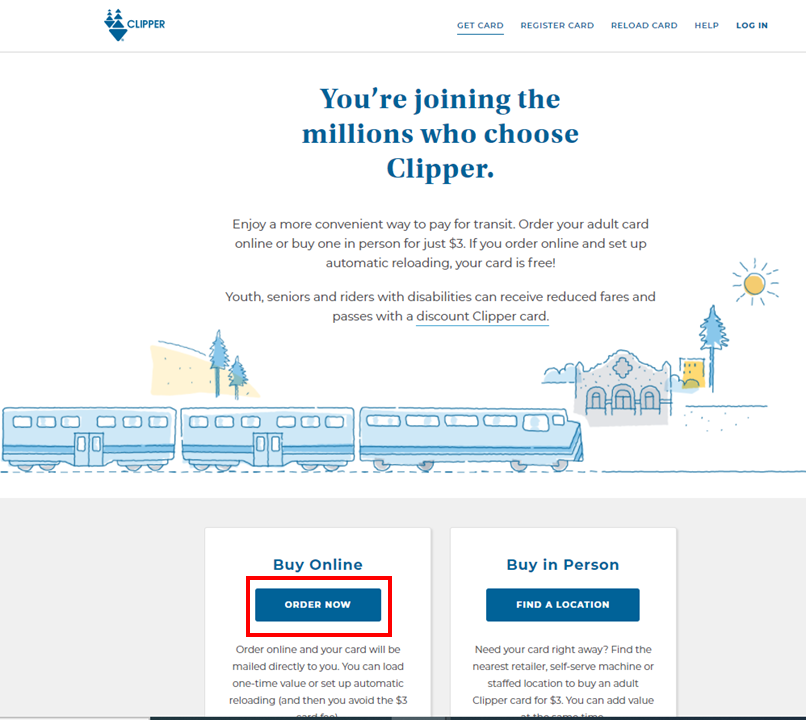 1. Visit https://www.clippercard.com/ClipperWeb/index.do and click Reload Card, then click Order Now.