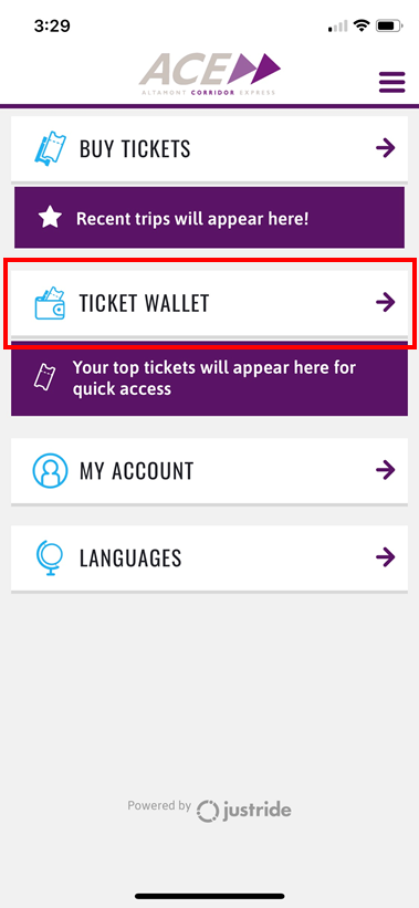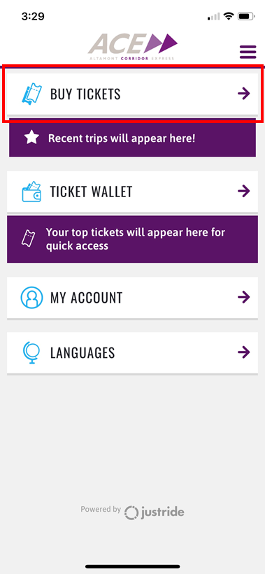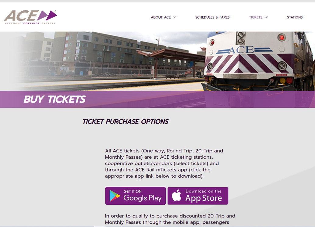 This transit agency offers in person and mobile app purchasing options. Download the ACE mobile app from the Apple App Store or Google Play Store, then follow these instructions to purchase your tickets on the mobile app.