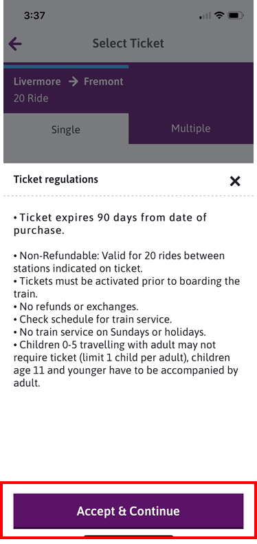 5. On the next screen, tap the ticket type you selected and tap Accept & Continue.