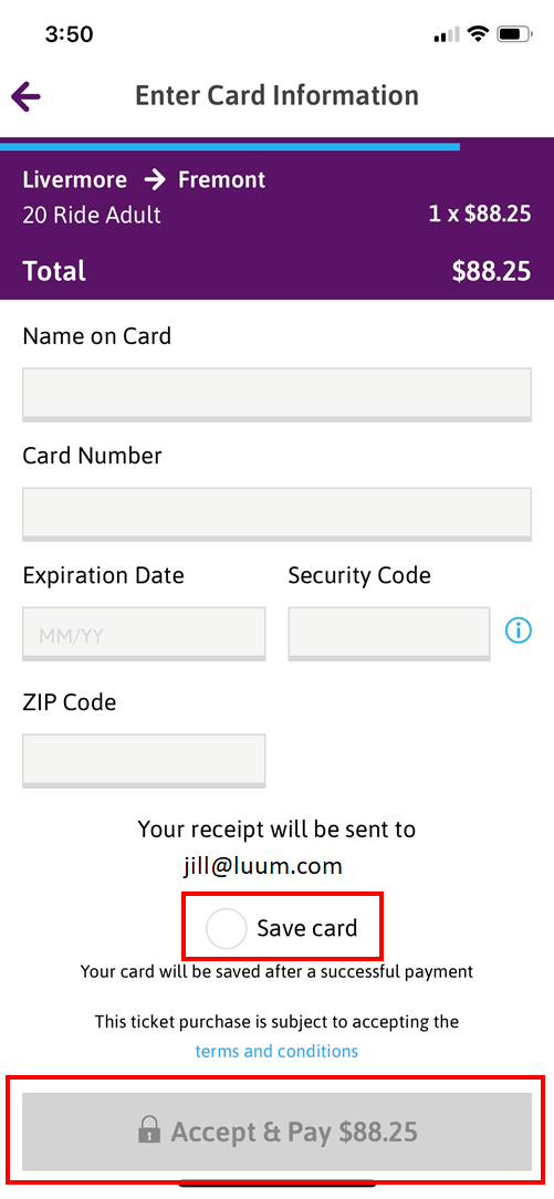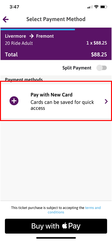 7. On the next screen, tap Pay with New Card. Then enter your Commuter Transit Card card details and select Save card. Tap Accept & Pay to complete your purchase. If you elected the Virtual Commuter Transit Card for Transit card option, follow the instructions in this article to find your card details.