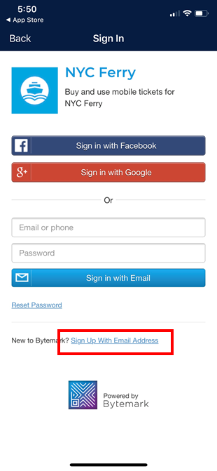 2. In the NYC Ferry Mobile App, create an account by tapping Sign In and then Sign Up with Email Address.