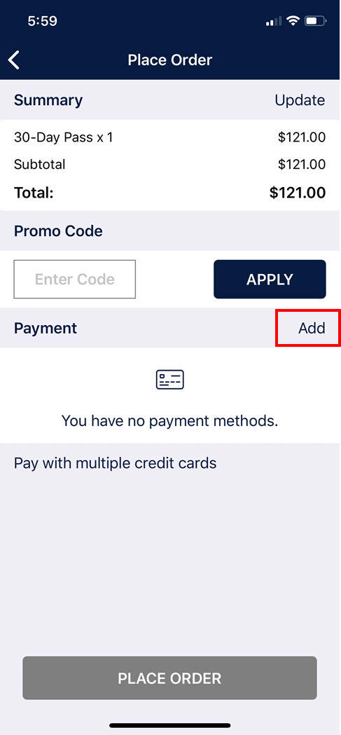 4. Tap Add on the right side of the screen and enter your Commuter Transit Card details. Tap Save, then tap Place Order. If you elected the virtual Commuter Transit Card option, follow the instructions in this article to find your card details.