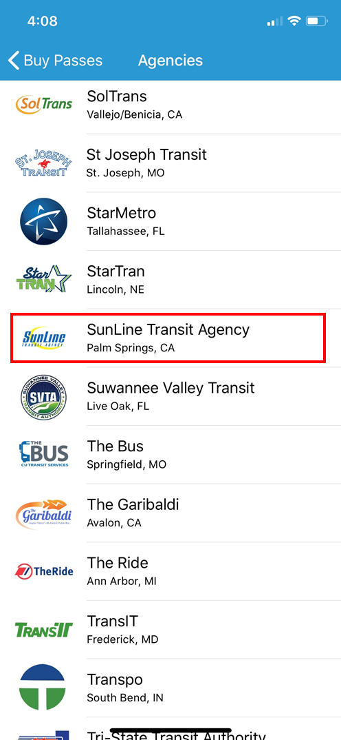2. In the mobile app, create an account and tap Buy Passes. Choose SunLine Transit Agency from the Transit Agency menu.