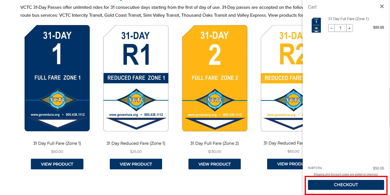 3. When you've added your preferred transit pass options to your cart, click Checkout in the bottom right corner of the screen.