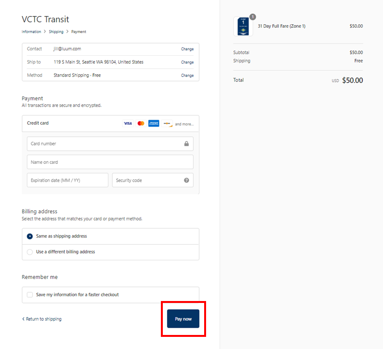 6. Enter your Commuter Transit Card details and click Pay Now to complete your purchase. If you elected the virtual Commuter Transit Card option, follow the instructions in this article to find your card details.