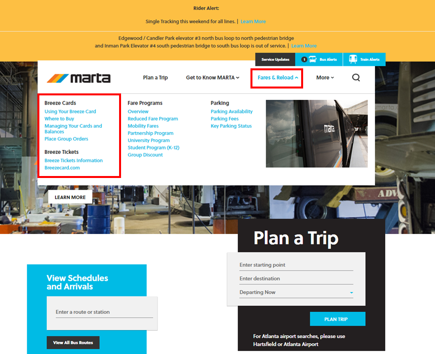 1. Visit https://www.itsmarta.com/ and hover over Fares & Reload. Read through the information about MARTA Fares and Breeze Card usage.