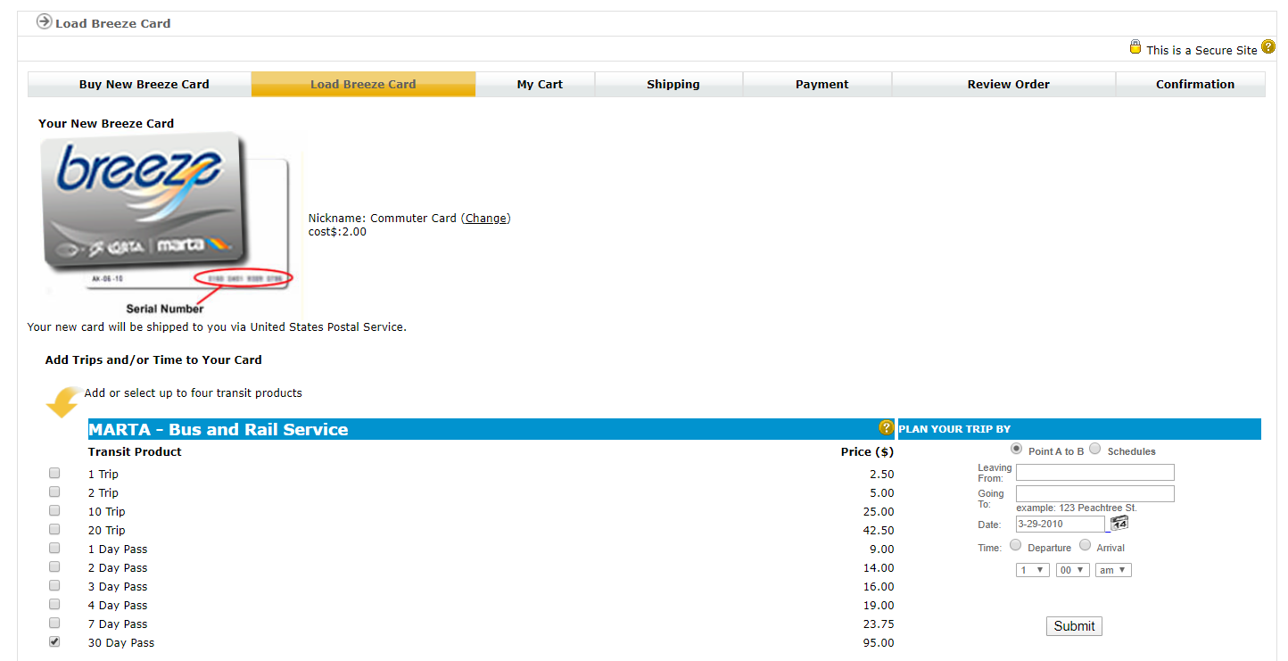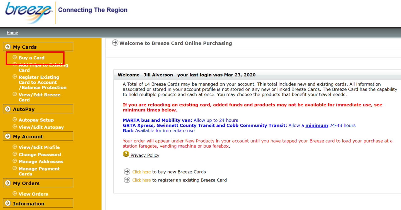3. If you already have a Breeze Card account, log in. Otherwise click Sign Up Now to create an account and order a Breeze Card. After signing in, click either Buy a Card or Add Trips to Existing Card, as applicable. The following instructions apply to the Buy a Card workflow.