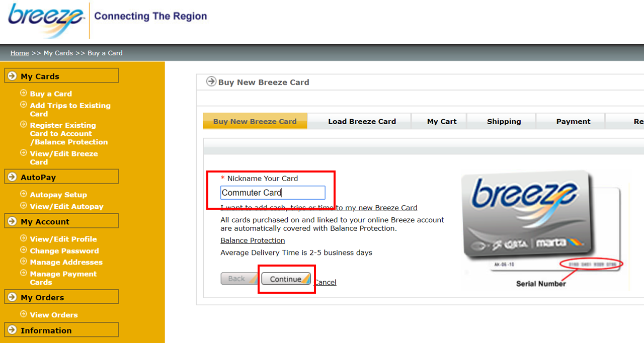 4. Determine a nickname for your card, for example 'Commuter Card' and enter it in the box. Then click Continue.