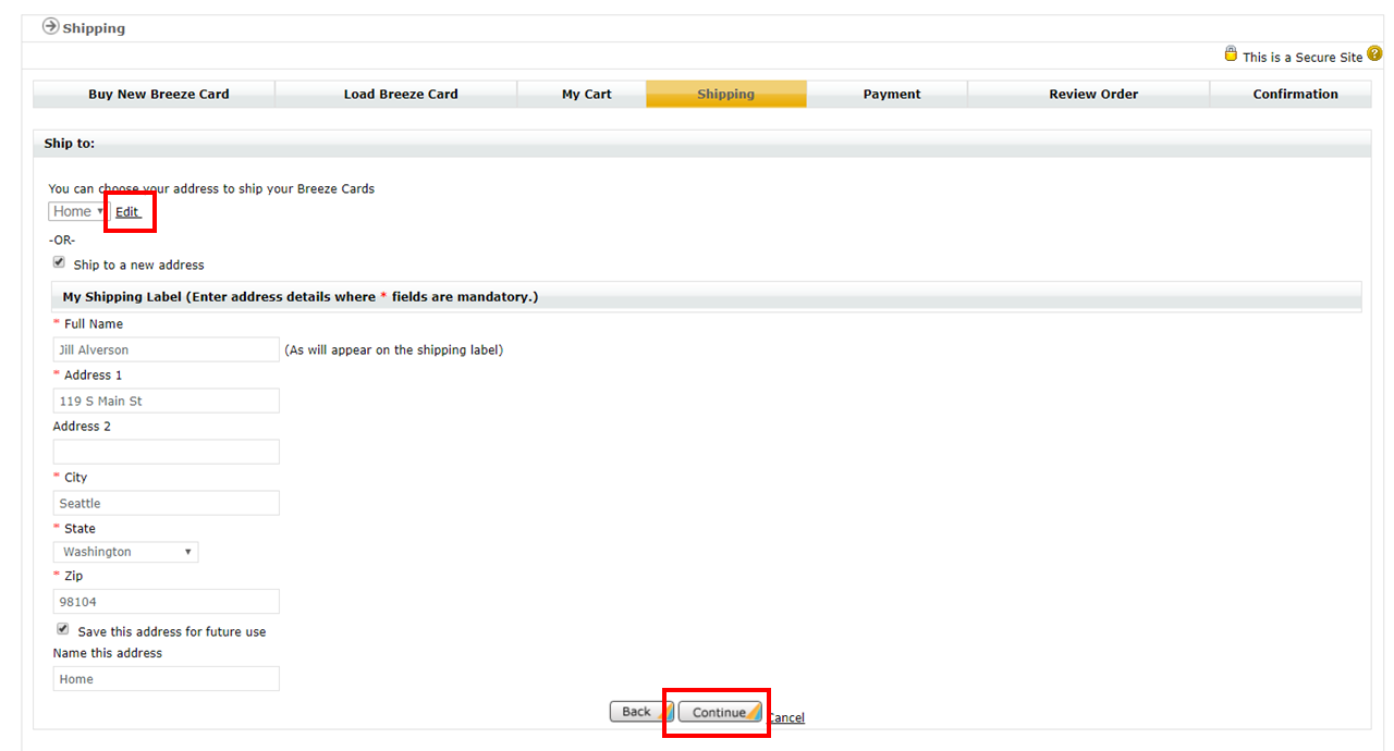 6. By default, your card will be shipped to the home address that was entered during account setup. To add a different shipping address, check the Ship to a new address box and enter your shipping details. Then click Continue.