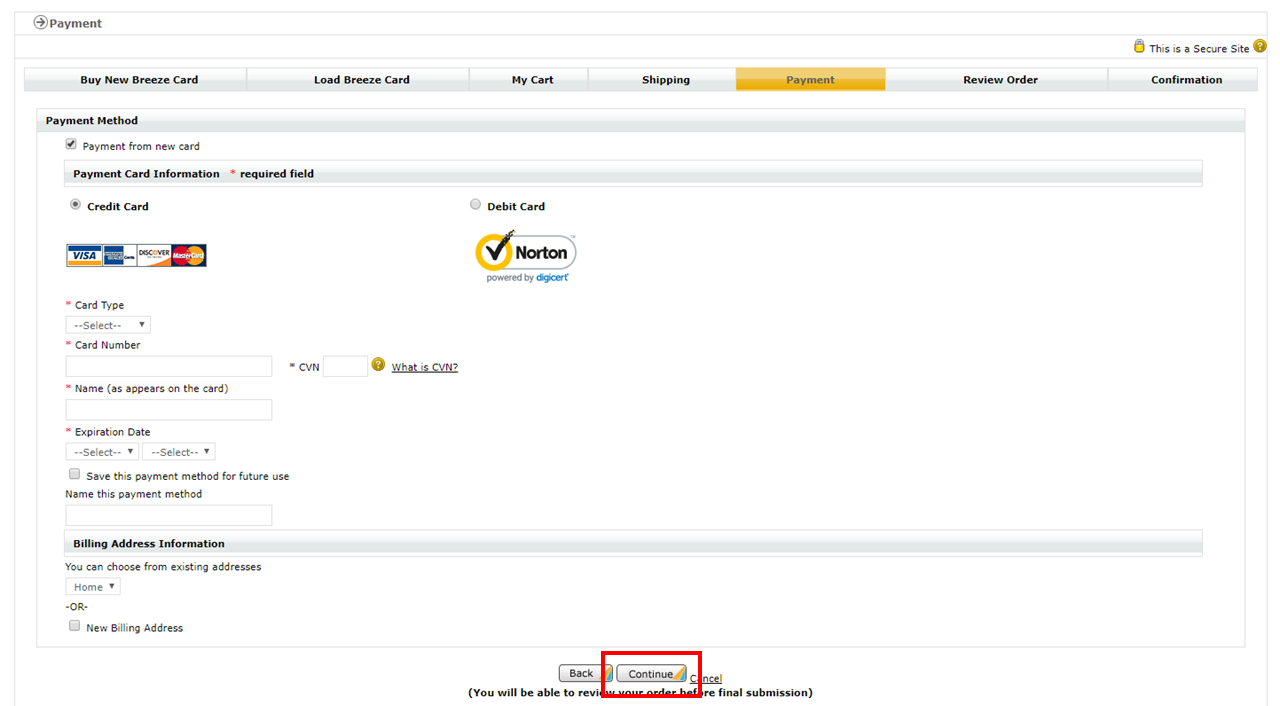 7. Enter your Commuter Transit Card details as your payment type, then click Continue. If you elect the virtual Commuter Transit Card option, follow the instructions in this article to find your card details.