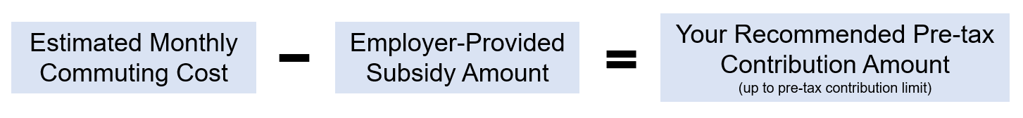 Your Commuter Benefits program is designed to provide the most flexible options that help you maximize your pre-tax contribution. During the benefit elections process, you will see how these benefits are processed from a tax perspective as you make selections. In general, the following simple formula is recommended to help you maximize your pre-tax contribution.