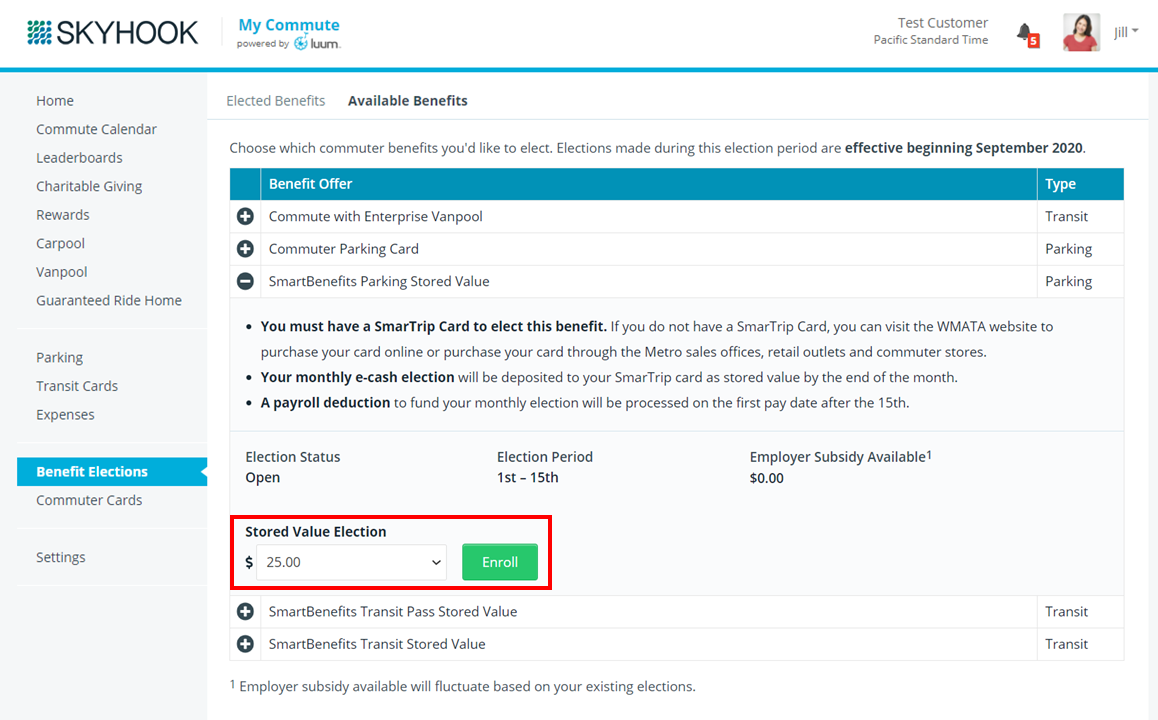 The SmartBenefits parking card can be used to pay for parking at Metro locations. Commuters living in the Washington Metro Area will need to directly elect their SmartBenefits parking card within their employer's commute website. This article describes the steps to take to enroll in a WMATA SmartBenefits parking card benefit.