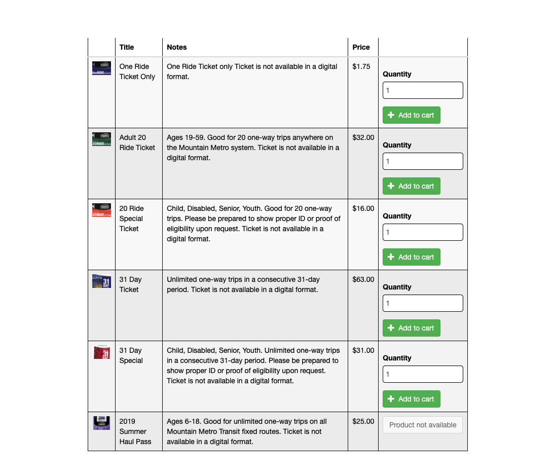 The Metro Mountain Transit transit agency offers online purchasing options. For the most flexible experience, we recommend following these instructions to purchase your passes: